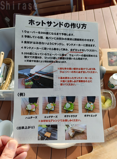 ホットサンドはガスコンロで焼くタイプですが、ちゃんと手順も用意されていて親切です。