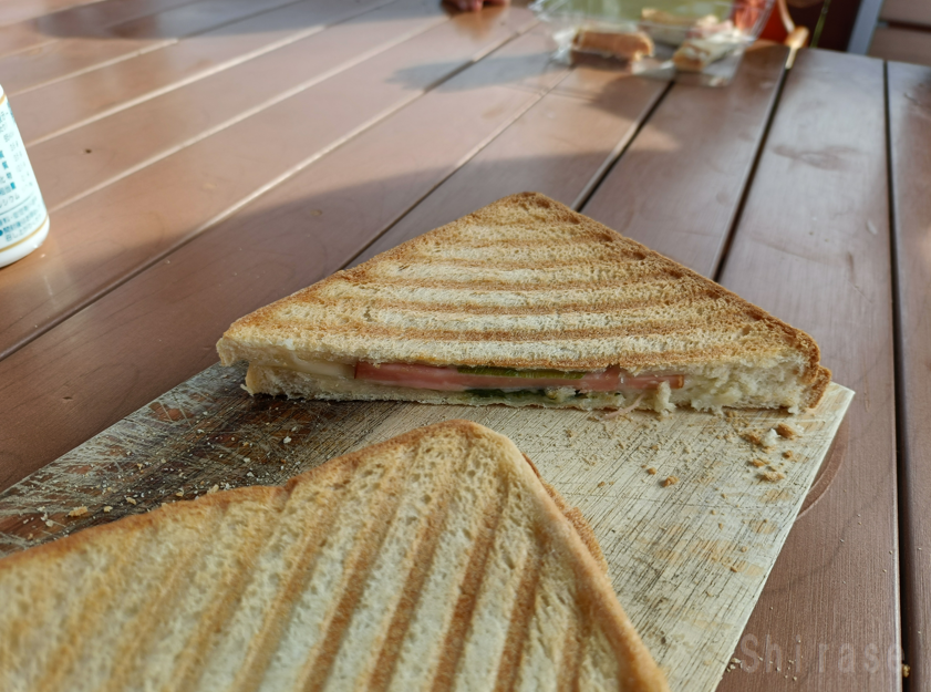 外で食べる出来立てのホットサンドの朝食、めちゃくちゃおいしかった。